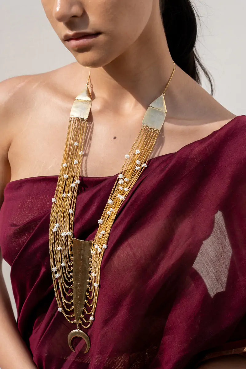 Our Champa Haar is inspired from the iconic Rani Haar. The Rani Haar has evolved into many versions over the years, and our Champa Haar meshes the iconic design with the beautiful combination of brass, beads, kundan, and chains.