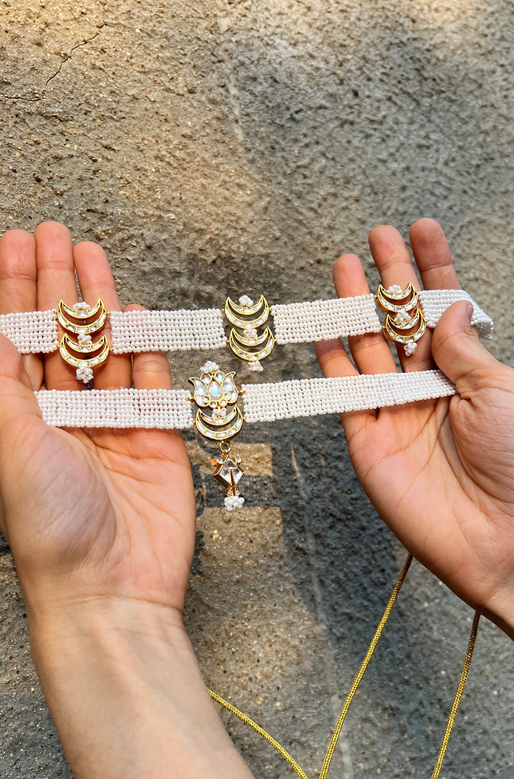 Moti Choker uses age old technique of weaving beads to make jewellery. We have made a minimal yet striking choker using different combinations of motifs. Keeping it elegant, striking and simple.